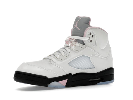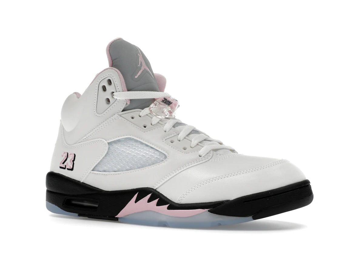 Der Air Jordan 5 Retro Medium Soft Pink setzt auf ein helles, roséfarbenes Upper mit weißen und durchscheinenden Akzenten. Klassische AJ5-Details wie die Haifischzähne und die Netzeinsätze bleiben erhalten.