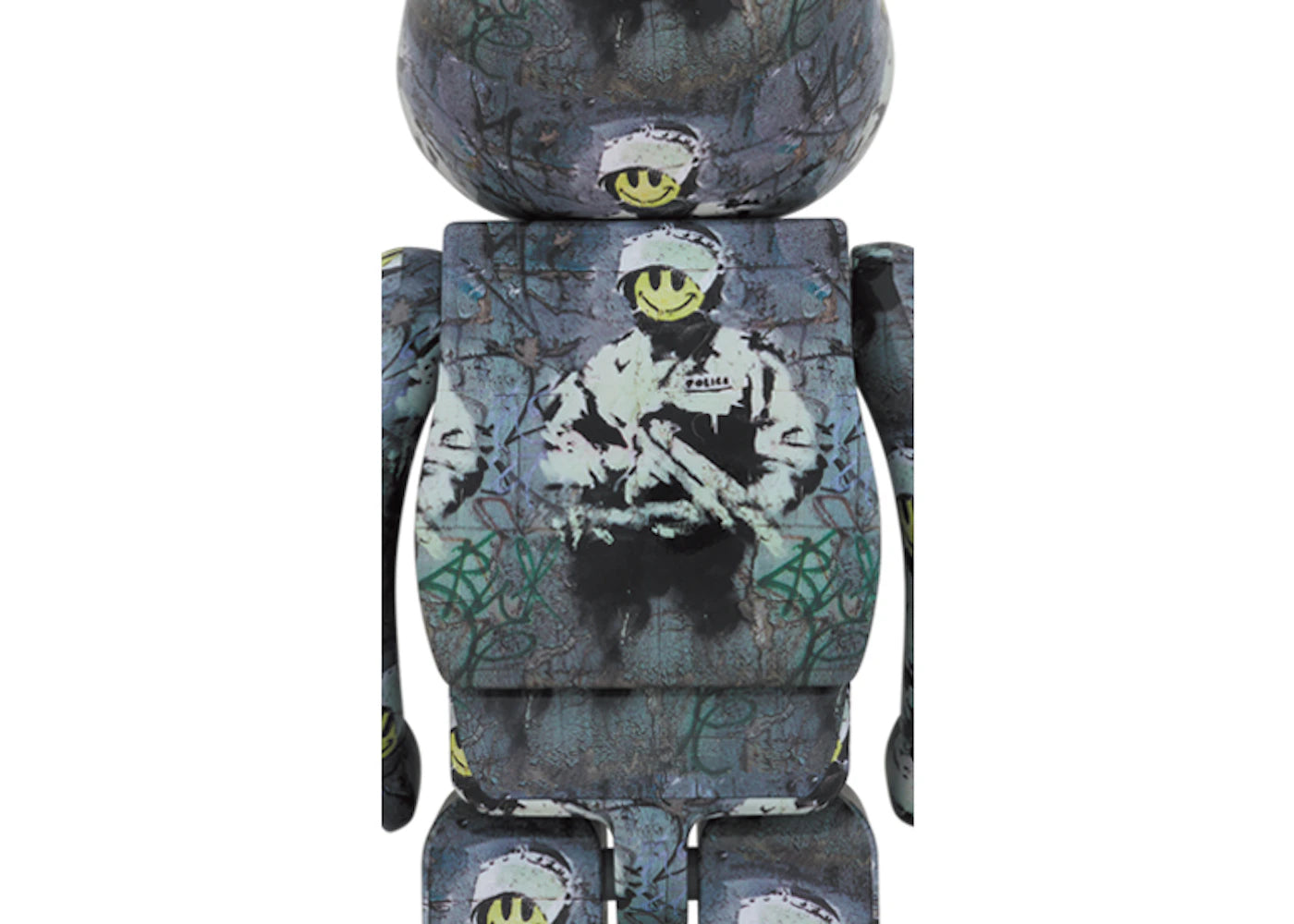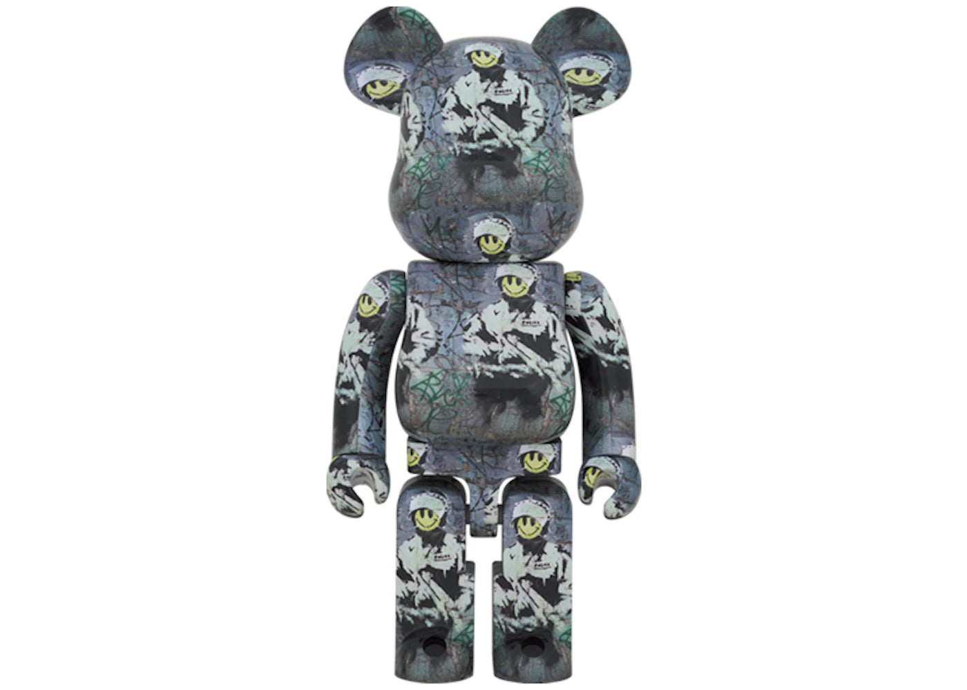 Bearbrick Riot Cop 1000% – Ein außergewöhnliches Sammlerstück für Kunst- und Designliebhaber. Inspiriert vom ikonischen Banksy-Motiv "Riot Cop" entstand in Zusammenarbeit von Medicom Toy und Brandalism diese eindrucksvolle Figur in XXL-Größe. Mit einer Höhe von 27,5 Zoll (ca. 70 cm) zeigt der Bearbrick ein vollständig bedrucktes Design auf dunkelgrauem Hintergrund und das auffällige gelbe Smiley-Gesicht des legendären Riot Cop, der eine Maschinenpistole hält.