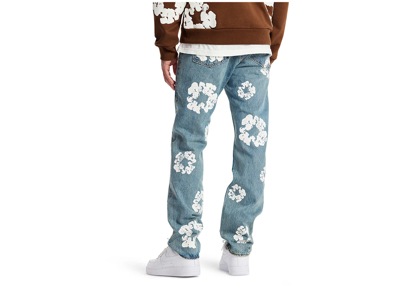 Denim Tears x Levi's Cotton Wreath Jean Light Wash – stylisher Streetwear-Jeansklassiker für Herren. Diese Light Wash Denim-Jeans verbindet das ikonische Design von Levi's mit den kunstvollen, dezenten Baumwollkranz-Prints von Denim Tears. Ein Must-have für alle, die lässigen Stil und hochwertige Verarbeitung schätzen.