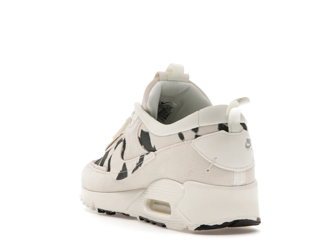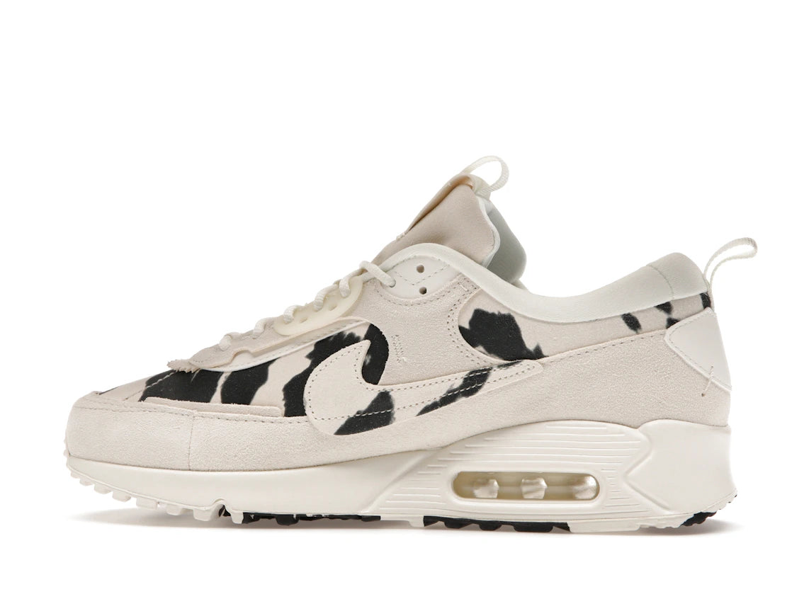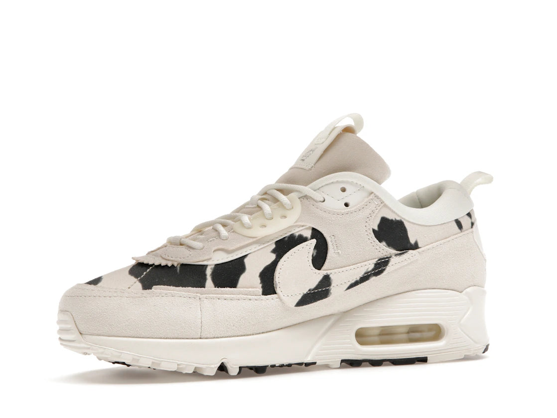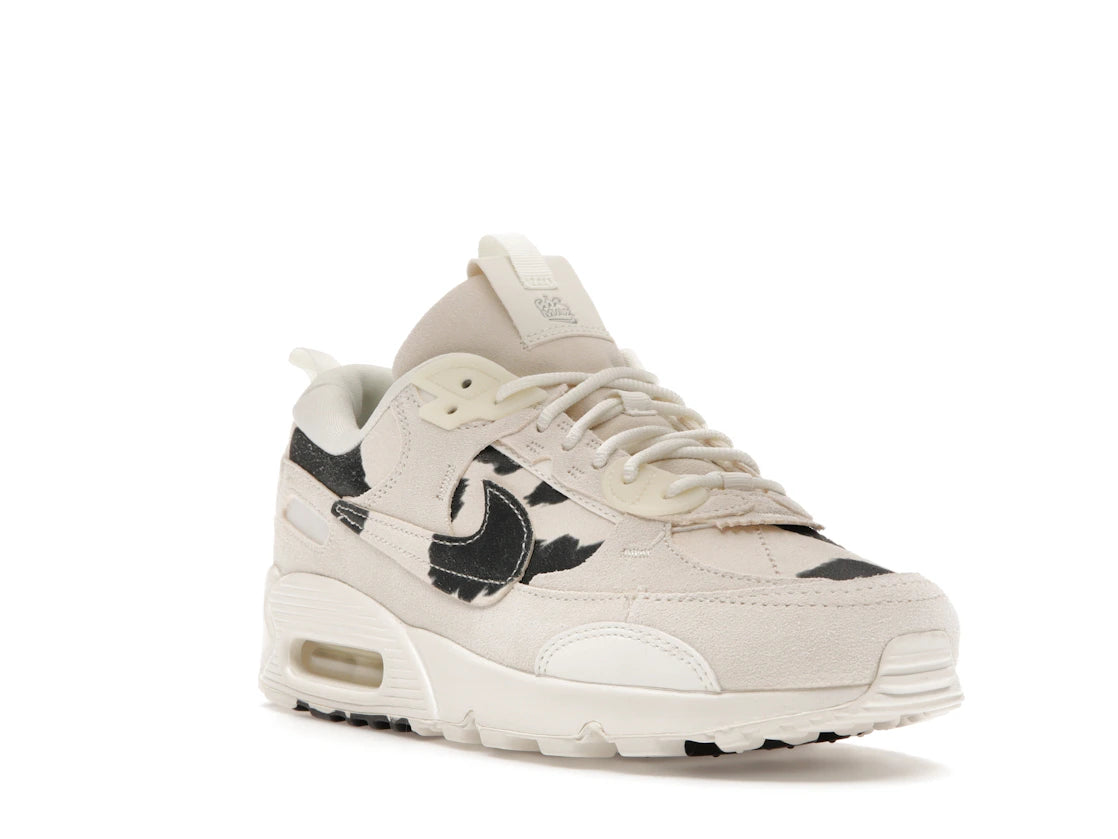 Nike Air Max 90 Futura Cow Print (Women's): Ein Sneaker, der klassischen Style mit einem originellen Kuhmuster verbindet. Die cremefarbene Wildlederbasis mit schwarzen Flecken macht diesen Damenschuh zu einem echten Hingucker. Die markanten, strukturellen Overlays und der seitliche Swoosh in Kuhmuster sorgen für einen besonderen Look.
