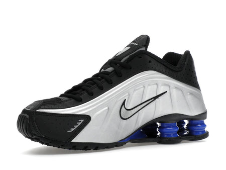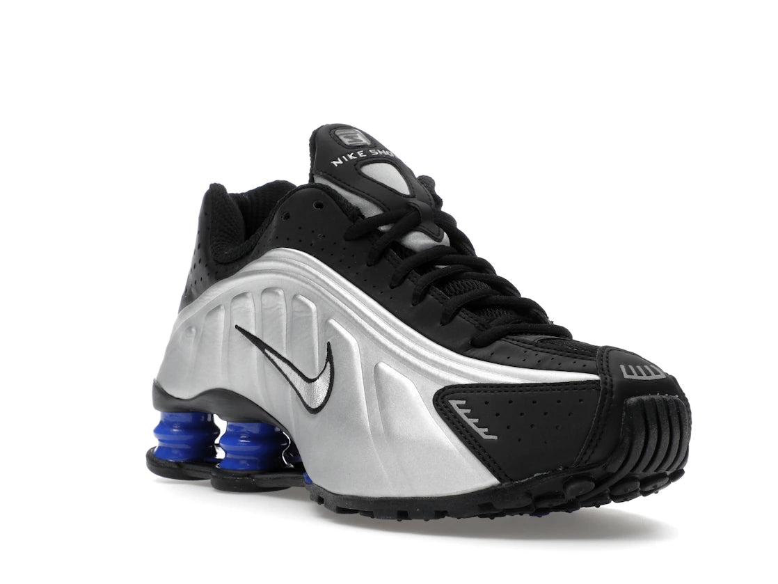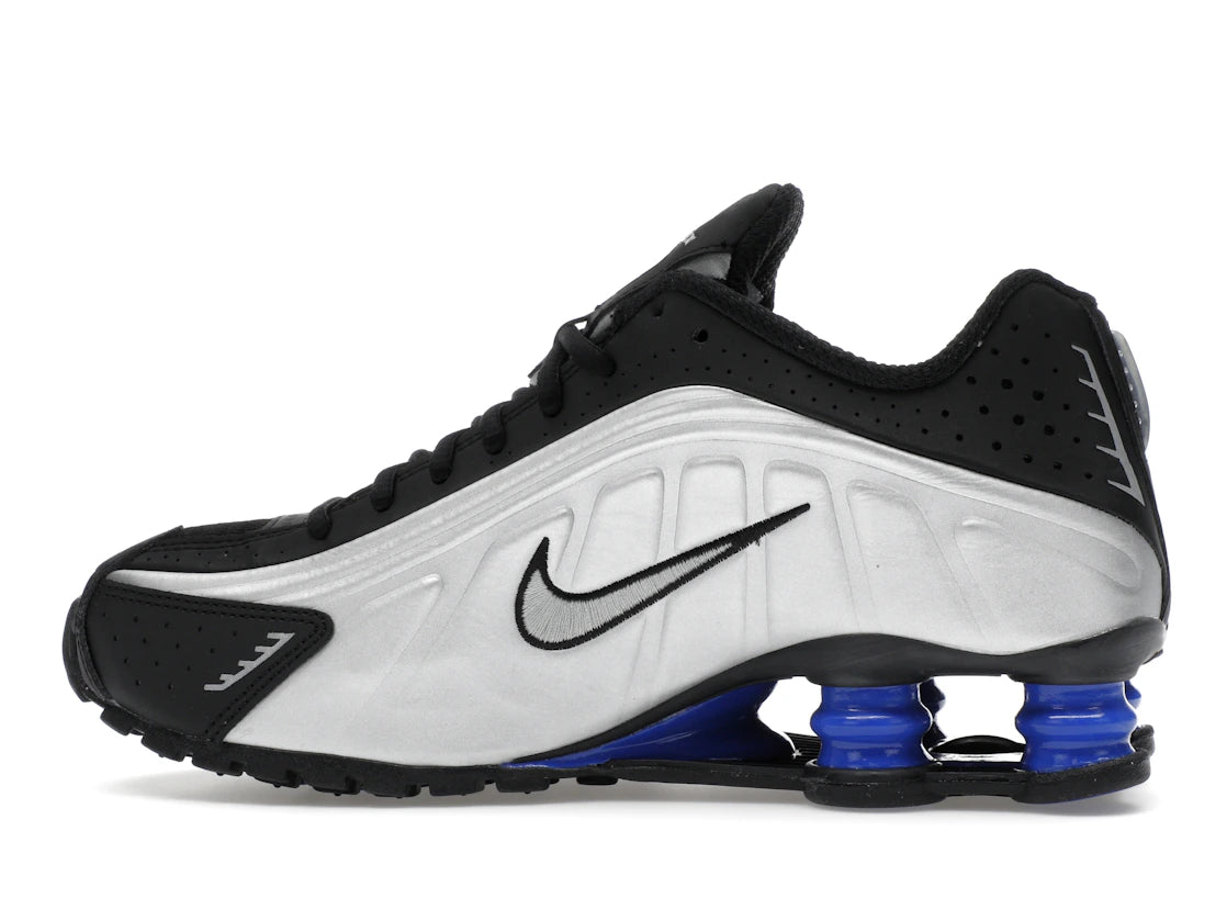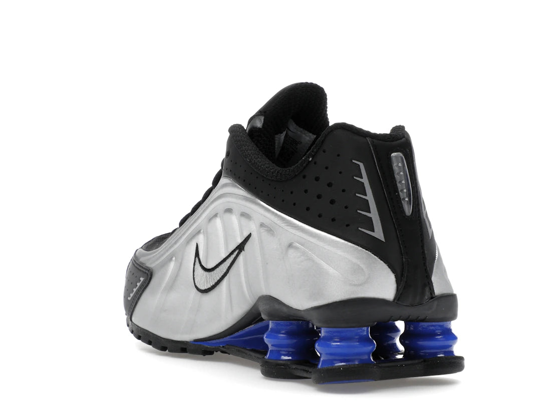 Nike Shox R4 Metallic Silver Black Racer Blue – Moderner Komfort trifft auffälliges Design. Dieser Sneaker für Damen überzeugt durch seine prägnante Farbkombination aus Metallic Silber, Schwarz und Racer Blue und bietet gleichzeitig eine optimale Dämpfung für den Alltag.